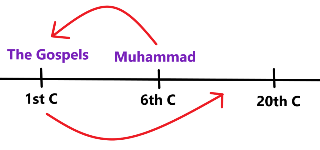 The Gospels were “revealed” to Jesus in the first century, and the Quran affirms that the gospels are from Allah(See Surah 5:68) in the 6th century, then the Gospels would have had to been corrupted after the 6th century. But the issue with this is that we have manuscripts of the Gospel that date before Muhammad that align with our Bible today(see the Codex Sinaiticus.) So the claim that the Gospels are corrupted fails.